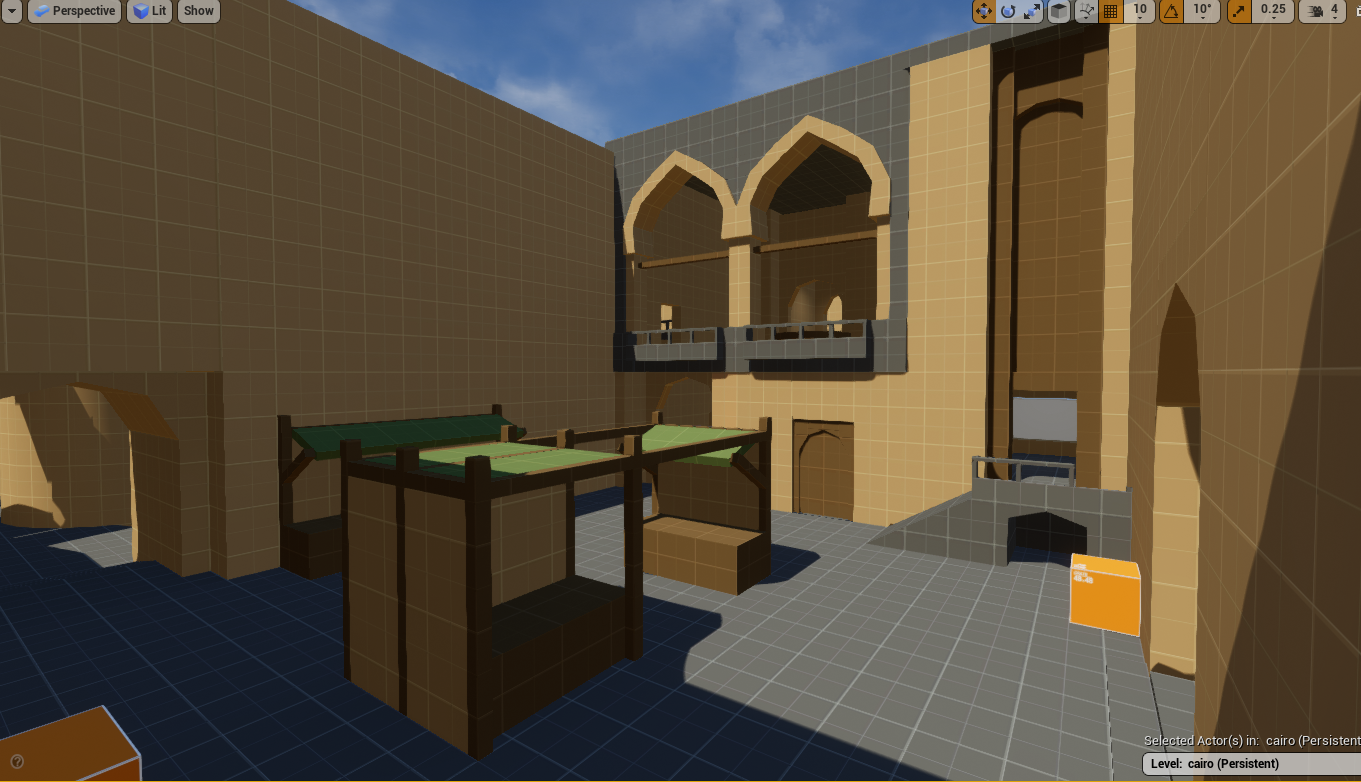 For Cairo, I blocked out the level in Unreal using scaled primitives. The project used multiples of 10 rather than power-of-two grid sizing, so I created a custom set of blockout meshes in Blender to match those constraints.